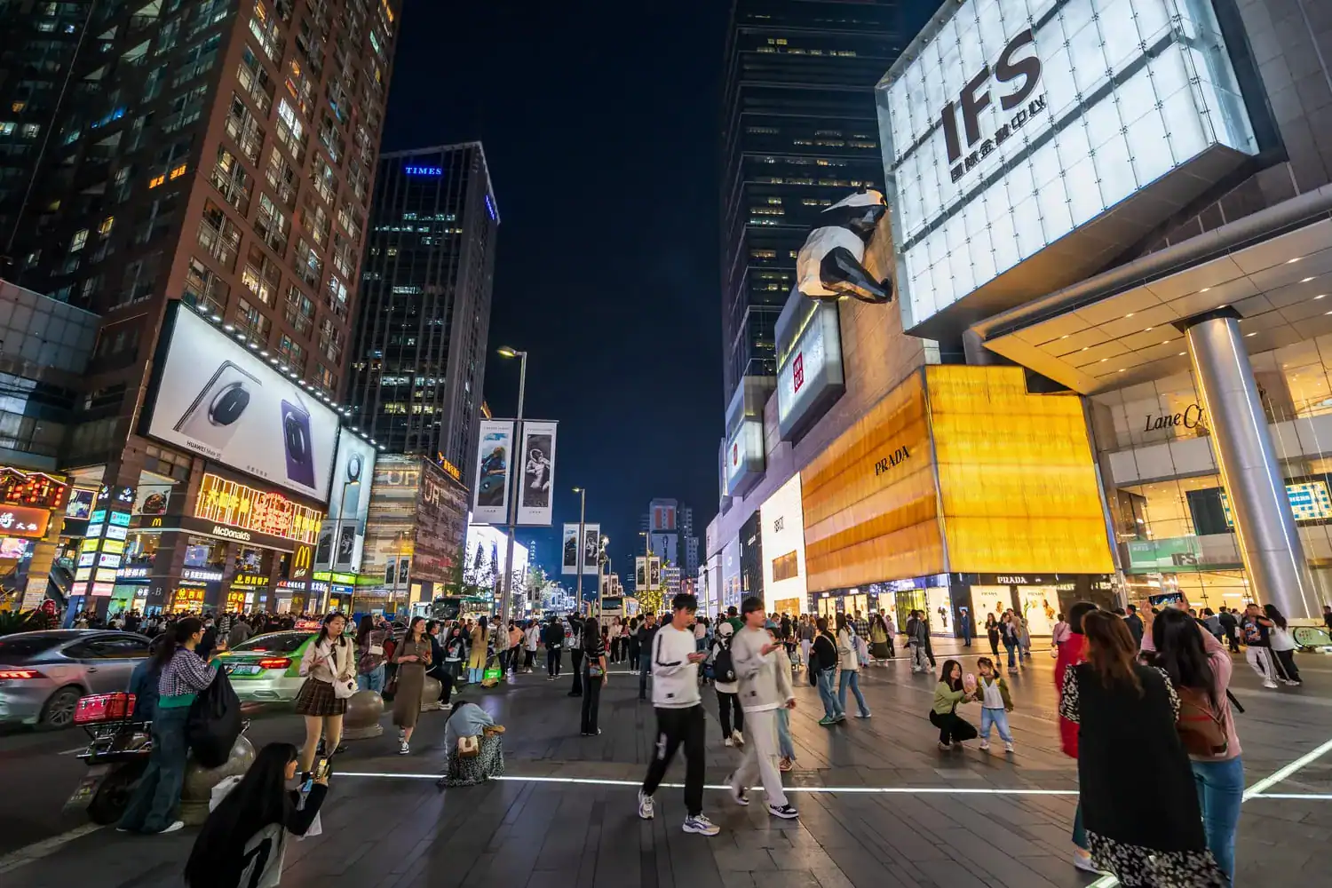 - ถนนคนเดินชุนซีลู่ ย่านช้อปปิ้งชื่อดังของเมืองเฉิงตู ทั้งสองฝั่งเรียงรายไปด้วยร้านขายสินค้ามากมาย
